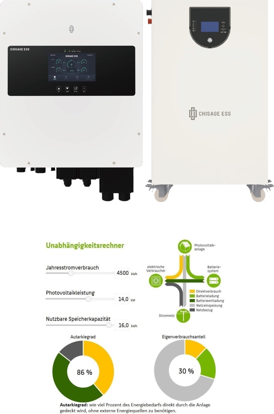 2) Chisage hybrid Wechselrichter 12KW Leistung. Lithium-Eisenphosphat-Akku, Chisage MOON16-G Pro Lithium-Eisenphosphat-Akku16 Kwh, Nach 8000 Lade- und Entladezyklen (was in der Regel etwa 20 Jahre dauert) behält der Akku immer noch ca. 75% seiner Leistung bei.